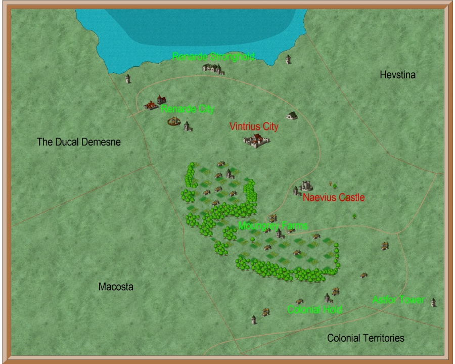 Vintrius is a barony with a small coastal area in the Bay of Acris in Vavard. One of the original domains where the first settlers moved during Dav's consolidation, it is also the one has has drifted into the most conflict during recent years. After the death of the whole Renarde lineage, the old barons, to the hands of a rebellion, the Duke of Vavard was forced to choose a new baron: Davon dal Naevius and his wife, Yarena dul Naevius. During their coronation, the residence was attacked and the baron was brought to the village of the castle and executed in public view, leaded by the leader of the revolution, Kaython dul Pondulle. His wife died too, but their young child, Barcus, managed to escape with the help of his newly-appointed regent, Quintilius ab Moungrey.